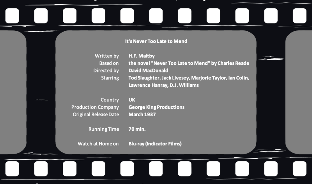 A title card before It’s Never Too Late to Mend (1937) reads, “Controlled and Presented by The Rev. Brian Hession, M.A., copyright Dawn Trust.” My puzzlement was reinforced when I learned that Hession, who was at the time a vicar, had created Dawn Trust Films to bring religious themes to mainstream cinema. So this was going to be a religious film?