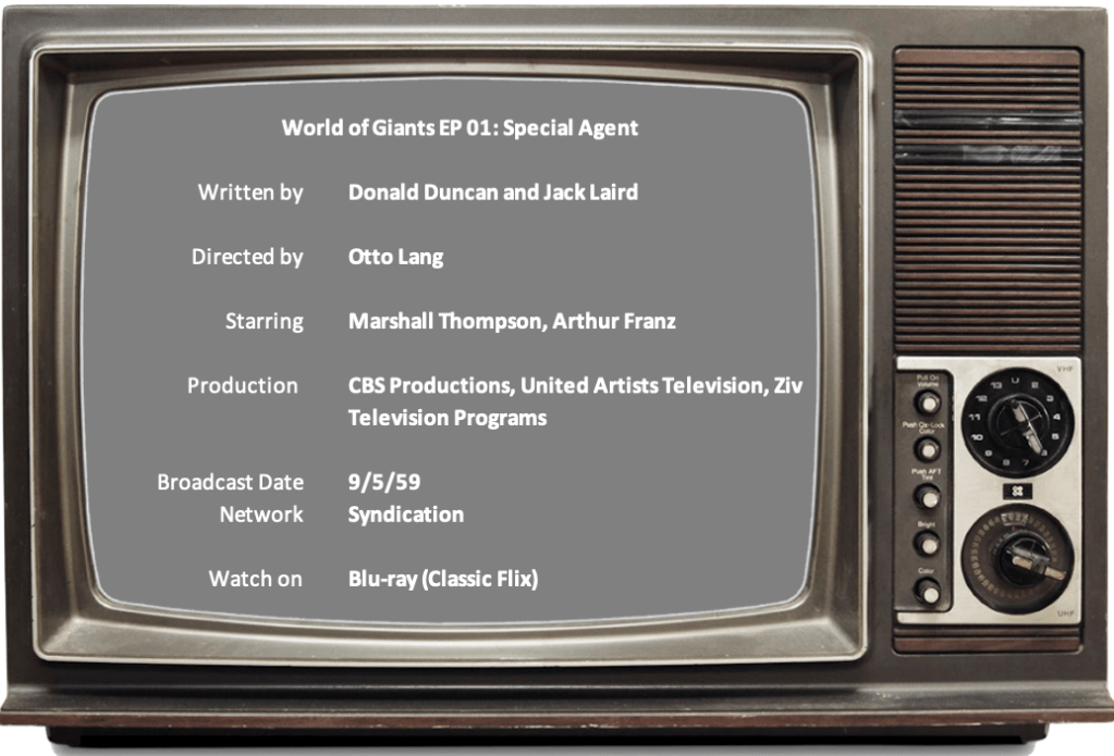 In the premiere episode of World of Giants (W.O.G.), “Special Agent,” we learn that while on a secret mission in the U.S.S.R., a rocket explosion during an experiment caused agent Mel Hunter (Marshall Thomson) to shrink to about six inches in height. It was essential to keep his condition classified, of course, because a man his size would be invaluable to “the bureau.”