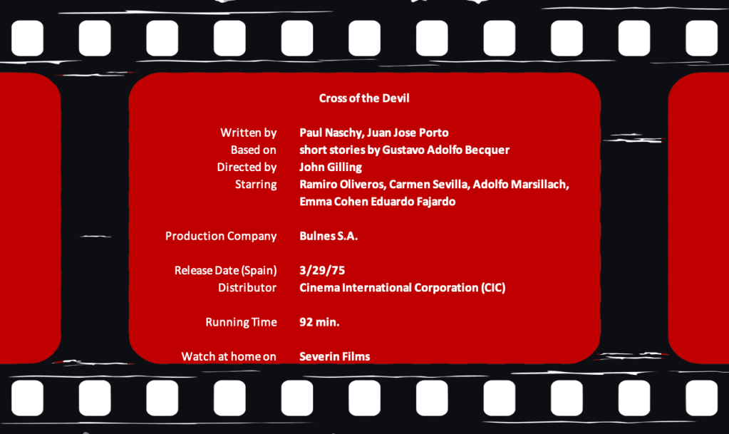 John Gilling directed what, on some days, is my favorite Hammer film: The Plague of the Zombies (1966.) Nearly a decade later, he directed his final film in Spain: Cross of the Devil, or The Devil’s Cross,aka La cruz del diablo (1975.) The subject matter of Cross of the Devil is also zombies, but different from voodoo slave zombies. Instead, they are none other than the Knights Templar, made popular by Amando de Ossorio’s ‘Blind Dead’ quadrilogy of films, one each year beginning in 1972.