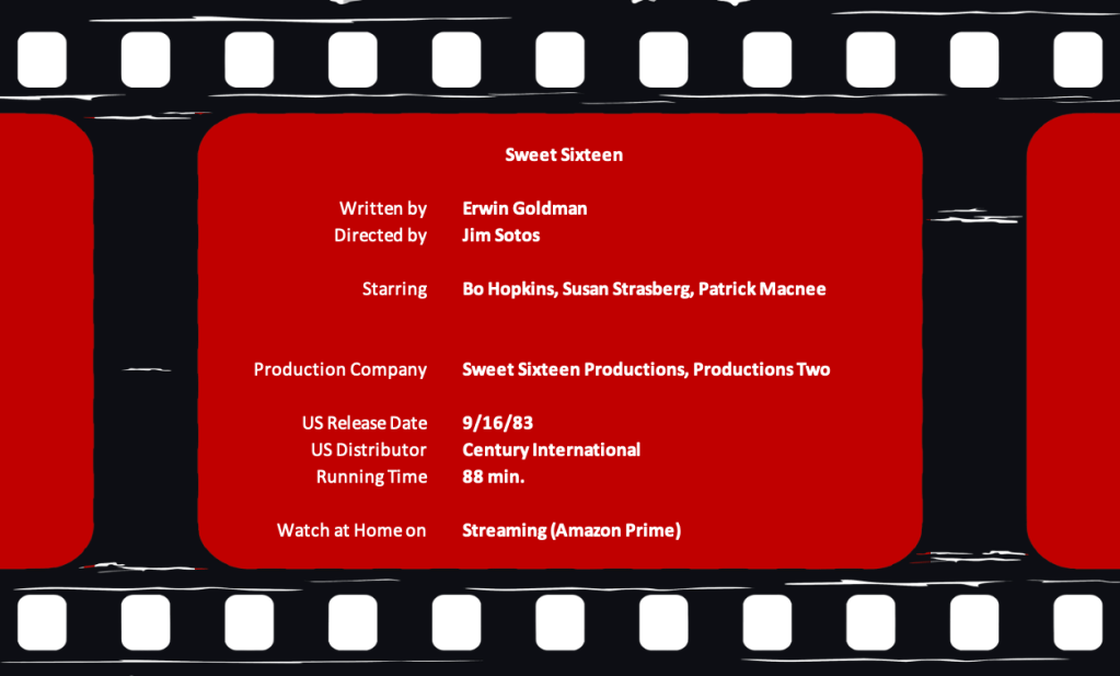 The bad news is that Sweet Sixteen is a mess. The good news is that it’s almost… almost a fun mess. My takeaway is in regards to Patrick Macnee. Close your eyes and you’d swear he was Donald Pleasance. That, of course, makes me think of Halloween. Now that’s a slasher. In only five years the subgenre launched by John Carpenter was reduced to this. Director Jim Sotos will fit better with his next film, the teen sex comedy, Hot Moves (1984.)