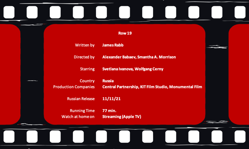 I have no information on the making of Row 19. Although there are a few American-looking names in the credits, it’s a Russian production. That means there are some sketchy CGI effects. If you’ve ever seen the Russian superhero film, The Guardians (2017), you’ll know exactly what I mean. Those happen outside the plane, though. While inside, the creatures and mysterious portals to other locations look just fine. There are a couple jump scares, but directors Alexander Babaev and Samantha A. Morrison seem more focused on the consistently spooky atmosphere.