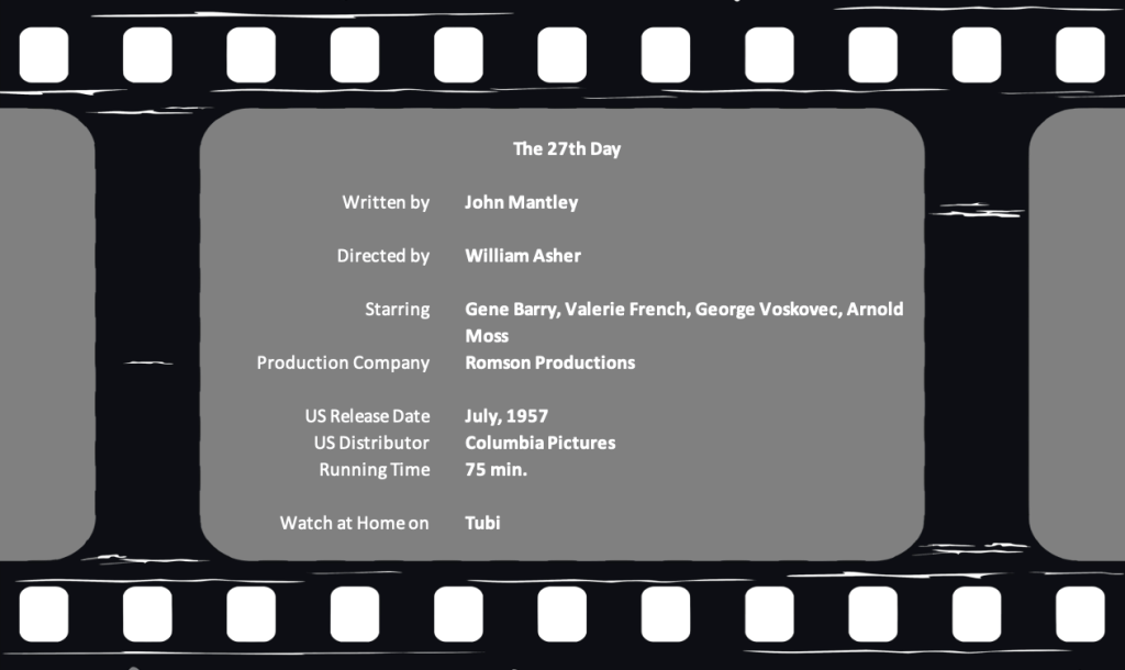 The 27th Day (1957) is a thinking man’s alien invasion movie, full of almost more big philosophical ideas than its 75-minute running time can hold. However, that’s the perfect running time to not notice what could be some pretty big flaws. Even now I must think about it carefully before I write about its plot points. There’s one in particular that I still don’t understand.