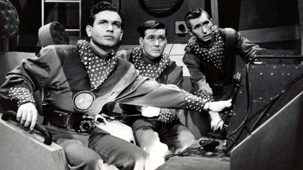 Granted, these two episodes may have been produced a few years after the Captain Video episodes, but the quality is superior. Don’t get me wrong, the production was still done on a budget, but the sets seem sturdier, the acting feels better, and there are even attempts at superimposing astronauts on the surface of Mercury, standing next to the Polaris. It’s a more sprawling series, with scenes that take place not only inside a spaceship, but also outside, and we see rockets traveling through space. I also like the cadet uniforms that include studded collars and cuffs.