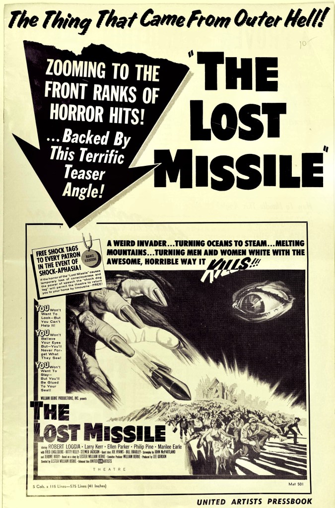 Talk about dedication to a project. On the first day of filming The Lost Missile (1958), director William Berke suddenly died of a heart attack. Not missing a beat, his son, Lester Wm. Berke, completed the film. However, I imagine most of the work fell upon the supervising film editor, Everett Sutherland, because much of the film is “stock footage of military forces and civil defense exercises.”